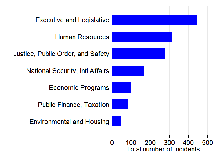 In a previous blog, we saw the number of cyber incidents across all sectors of business, based on a sample of 12,000 events over the years 2004-2014. Next, we examine just the subsample of incidents affecting municipal, county, state and federal government agencies. The chart below reflects the various subsectors of governmental organizations victimized by cyber attacks during this time period, which totals just over 1,400 incidents.