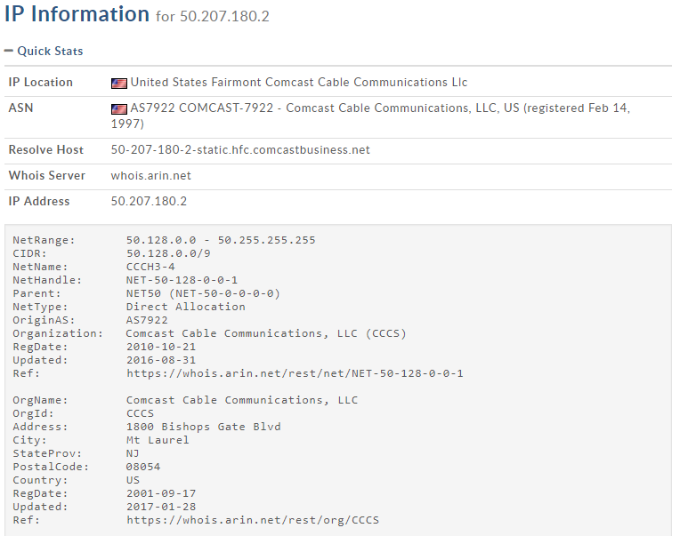 IP addresses are often instrumental in internet investigations. Every device that connects to the internet requires an IP address. An IP address can be provided by a company like Facebook or Twitter for a person’s recent login IP address or from a website that is capturing traffic and logging IP addresses. These IP addresses can be used to identify an Internet Service Provider (ISP) like Xfinity and with the proper legal authority, the provider can share who was leasing that IP address.