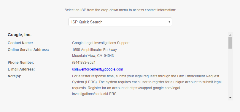 For this reason, it is very important to send preservation letters out before a suspect can dispose of any evidence. Many commercial providers, such as Yahoo, change their policies often. One helpful resource is http://www.search.org/resources/isp-list, which maintains a comprehensive Internet Service Provider (ISP) list along with other online content providers. Instructions for how to obtain information, whether via subpoena, court order(s) and/or search warrants, are provided in this database along with contact information and current Law Enforcement Guides which outline the company’s information-sharing policy.