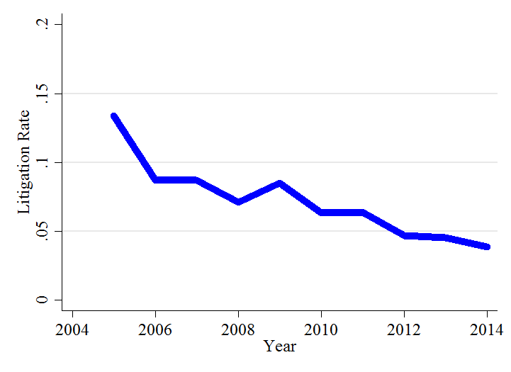 As the number of cyber attacks continues to grow, litigation rates of cyber crime, both criminal and civil, are dropping. Litigation rates (percent of data breaches litigated in federal court) dropped approximately 5 percent from the previous year, despite increased rates of attacks (see below graph).